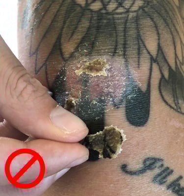 Taip turi atrodyti gyjanti tatuiruotė. Plona odelė lupasi, o ne šašas.