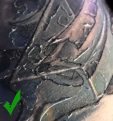 Oda yra stipriai išsausėjusi, gali labiau niežėti. Yra susidaręs kietas šašas, taip atsitinka išsausinus tatuiruotę ir per mažai drėkinant odą.